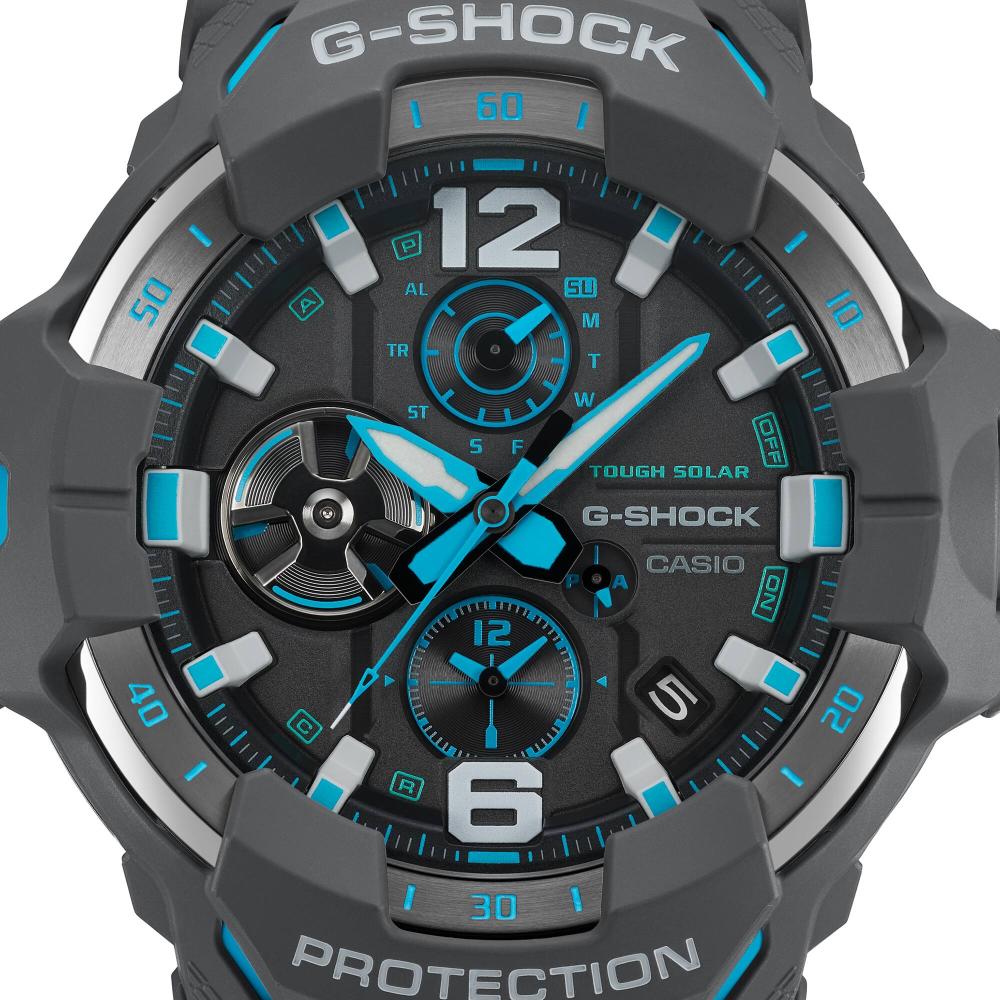 لا شيء مستحيل! نقدم طراز GRAVITYMASTER GR-B300، وهو قطعة من مجموعة G-SHOCK MASTER of G مستوحاة من معدات عالم الطيران الاحترافية والمصممة للعمل حتى في أقسى البيئات. يتميز GR-B300 ببنية حماية أساسية مصنوعة من الكربون، ويوفر مقاومة للصدمات والمتانة ومقاومة للتآكل التي توفرها مادة الكربون المستخدمة في هياكل الطائرات. يجتمع الهيكل المصنوع من الراتينج المعزز بألياف الكربون وتصميم الإطار السلس المستوحى من الجيل القادم من الطائرات في شكل جريء وقوي. تخيل العالم من خلال عيني الطيار مع وظيفة ذاكرة سجلات الرحلات لتسجيل الموقع والوقت الحاليين، بالإضافة إلى خاصية التوقيت المزدوج التي تعرض الوقت في منطقتين زمنيتين في آن واحد. بالإضافة إلى ذلك، ما عليك سوى النقر على التطبيق للتبديل الفوري بين التوقيت الأصلي والتوقيت المحلي، وهو وظيفة عملية لجعل السفر إلى الخارج أكثر سلاسة. تتميز علامات المؤشرات الكبيرة ذات الأبعاد والإطار المعدني الذي يبرز وجه الساعة الكبير بالفعالية، ما يعزز الرؤية المهمة جدًا للطيارين الذين تتطلب وظيفتهم قراءة الوقت بسهولة. يستخدم مؤشر القرص الدوار عند موضع الساعة 9 محركًا مزدوج الملف لضمان سلاسة الدوران وجمال الأداء. لا يدور المؤشر لعرض تشغيل/إيقاف المنبه وساعة الإيقاف فحسب، بل يعمل كمؤشر لمستوى البطارية أيضًا. يعكس مخطط اللونين الأبيض والأسود عالي التباين المنقط بلمسات ملونة على القرص والأزرار مظهر لوحة أدوات قمرة القيادة، بينما تعبر تدرجات الألوان الداكنة عن الوظائف العملية في عالم الطيران. صُنعت مكونات الراتينج الأساسية المستخدمة في الهيكل والإطار والسوار باستخدام الراتينج الحيوي، وهو مادة من المتوقع أنها تساعد على الحد من الأثر البيئي.