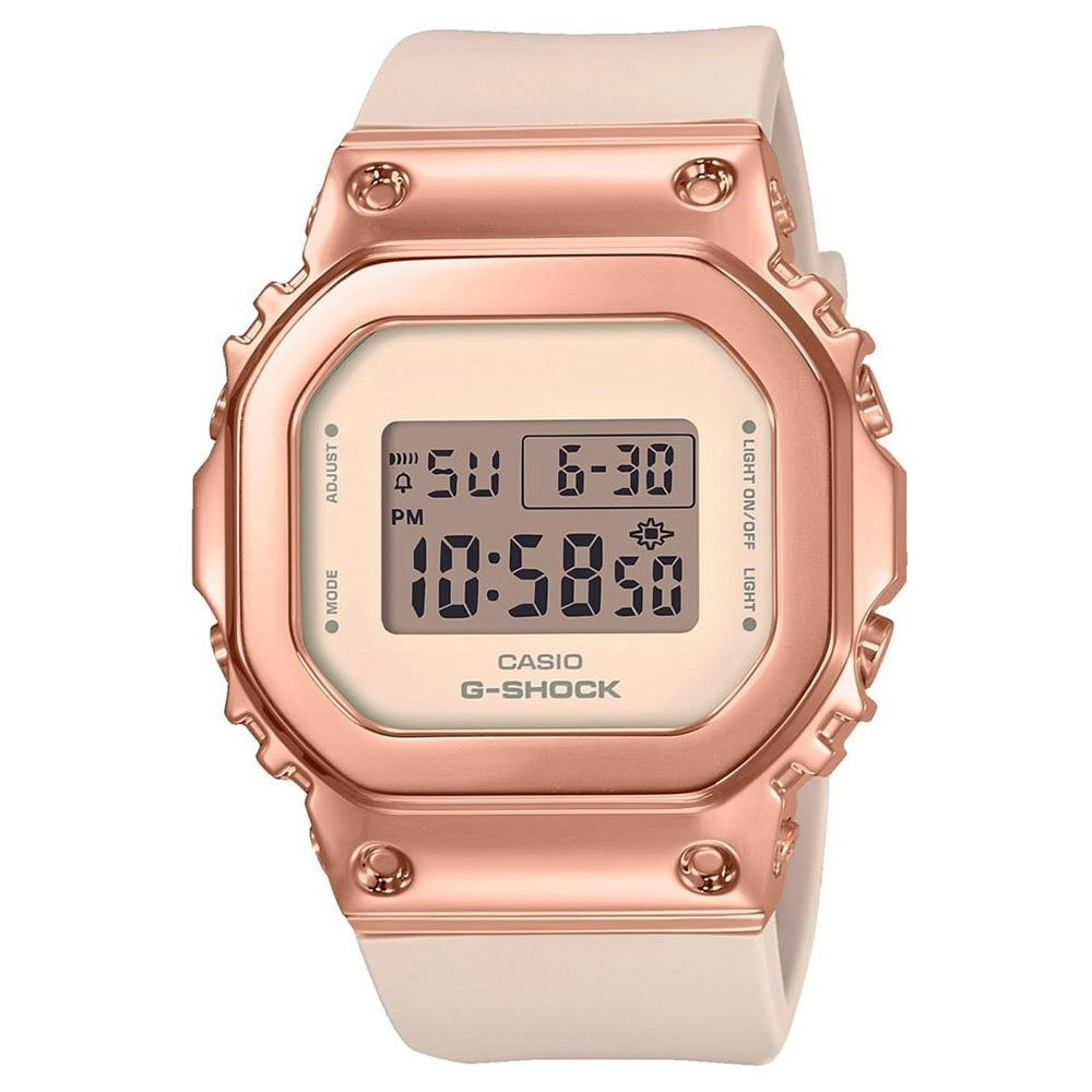 طراز مصغر من السلسلة 5600 الشهيرة ومزين بمعدن فاخر. تم تصميم الطراز GM-5600 بنمط مربع منذ الطراز الأول، وتم تصغير حجمه لتوفير مقاس مناسب خفيف الوزن ومريح. غطاء الإطار مصنوع من المعدن المطلي بطلاء مؤين باللون الذهبي الوردي، والسوار الأنيق بتصميم مستمد من G-SHOCK باللون البيج.