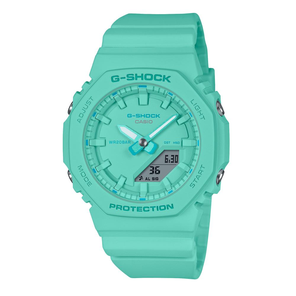 تمتع بمظهر ساعات G-SHOCK الرقمية والمشهورة مع مقاس مريح أكثر من أي وقت مضى. تأخذ ساعة GMA-P2100 تصميم ساعة GMA-S2100 الصغير بالفعل، وهي أقل حجمًا وأنحف، مع سوار بطول أقصر لتناسب المعاصم الأصغر مع الراحة التامة. لمسات نهائية أحادية اللون بألوان حيوية -الأزرق الفيروزي الديناميكي (لون جديد)، والوردي المشرق، والأبيض الكلاسيكي- رافعة للمعنويات، مع ترك القرص الداخلي في موضع الساعة 9 المأخوذ من طراز GMA-S2100 الأصلي للحصول على مظهر بسيط. يتميز وجه الساعة الأنيق والعملي بقرص وشعار وعلامات مؤشر وعقارب ومكونات أخرى مطلية بألوان مختلفة من اللون نفسه، ما يبرز الأناقة ويضمن سهولة القراءة في الوقت نفسه. الإطار والسوار لهذه الساعات مصنوعان من الراتينج الحيوي الذي يُنتج من موارد عضوية متجددة، وهي مادة يُتوقع أنها تساعد على الحد من انبعاثات غاز ثاني أكسيد الكربون وتقليل التأثير البيئي.