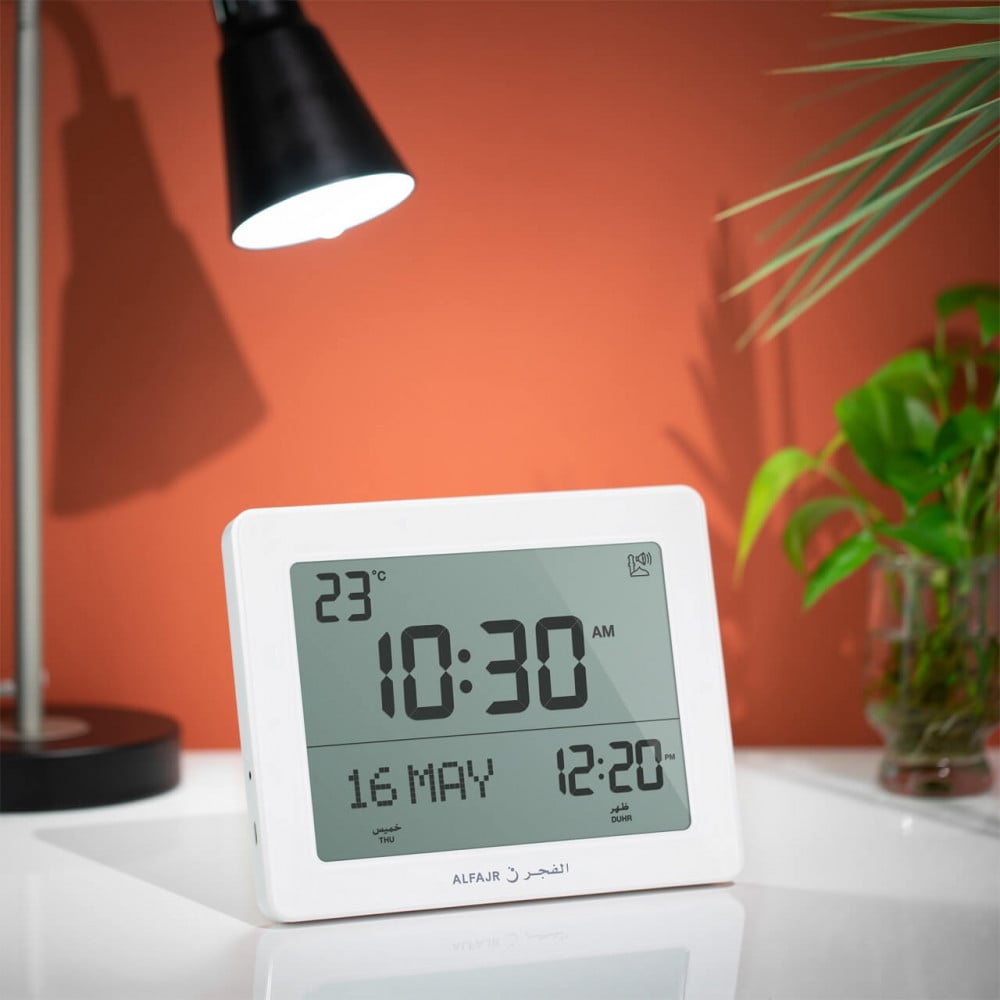 ســاعـة الاذان الجديدة من الـفجر بشكلها العصري المناسب للمكتب و الحائط مزودة بشاشة رقمية تظهر الوقت و التاريخ الهجري والميلادي ووقت الاذان القادم وبعض الخصائص الاخرى كما بالأمكان توصيلها بسماعات خارجية