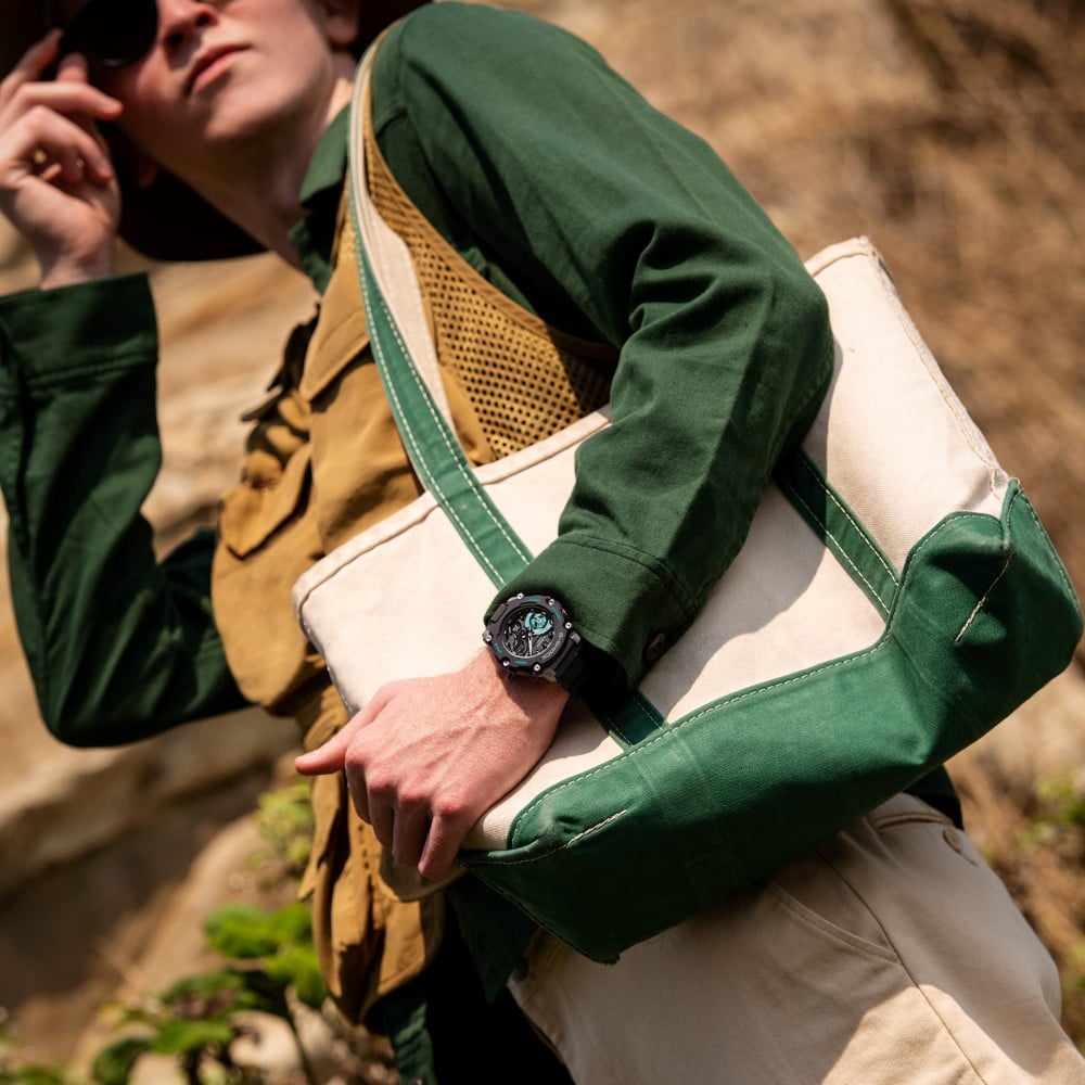 يمكنك خوض كل مغامرة باستخدام هذه الساعة المتينة التي تم تصميمها مع بنية حماية أساسية من الكربون، والتي تُعتبر أداة لا غنى عنها لمجموعة المعدّات الخارجية الخاصة بك. تندمج البنية الثلاثية الطبقات بسلاسة مع الإطار والجهة الخلفية من الهيكل والأزرار بهدف تقليص سماكة الهيكل حتى 12,4 مم فقط. تلغي الأزرار الجانبية الأكبر حجمًا والمقاومة للصدمات الحاجة إلى واقيات للأزرار بهدف الحصول على ساعة أصغر حجمًا. تتوفّر كل هذه الميزات من دون أي مساومة على سهولة الاستخدام - لا بل أصبح الاستخدام أسهل في الواقع. يعكس الإطار الدائري المزيّن بستة مسامير المتانة المطلوبة في المغامرات الكبيرة والصغيرة. تم تضمين مؤشر القرص المضمّن، المستوحى من قرص مكابح السيارات، في حلقة شبه دائرية، وتم طلاء كليهما باستخدام طريقة ترسيب البخار للحصول على المظهر المعدني للمعدّات الخارجية الفعلية. من بعد تصنيع الأجزاء والقرص بشكل منفصل، يتم تجميعها لإضافة أبعاد ديناميكية إلى وجه الساعة. تعمل الشاشة الرقمية بشكل قطري بين موضعَي الساعتَين 4 و6 للحصول على مظهر نهائي يوحي بالجرأة التامة. يمكنك الاختيار من بين الألوان الأربعة التالية: الأسود أو الأسود والفيروزي أو البرتقالي أو الفيروزي.