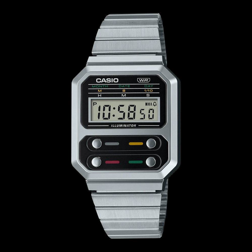 أطلق العنان لشغفك بكل ما هو كلاسيكي مع تصميم أحادي اللون لساعة Casio العريقة. تحيي مجموعة A-100 ذكرى ساعة F-100، وهي أول ساعة من Casio تم تصميمها بهيكل من الراتينج، كما تحيي ذكرى الأزرار الأمامية الأربعة المميزة مع إضافة مكونات معدنية على الطراز القديم لإصدار جديد محدَّث من تصميم كلاسيكي أصلي. تتوفر هذه الساعة بتصميم كلاسيكي ولكنها مزودة بوظائف عصرية، وتتميز بساعة إيقاف وتقويم ومقاومة للماء للاستخدام اليومي وبالطبع ضوء LED لسهولة القراءة في أي إضاءة. يمكنك استخدام المشبك الجانبي لتعديل طول الحزام بسهولة للحصول على مقاس مثالي.
