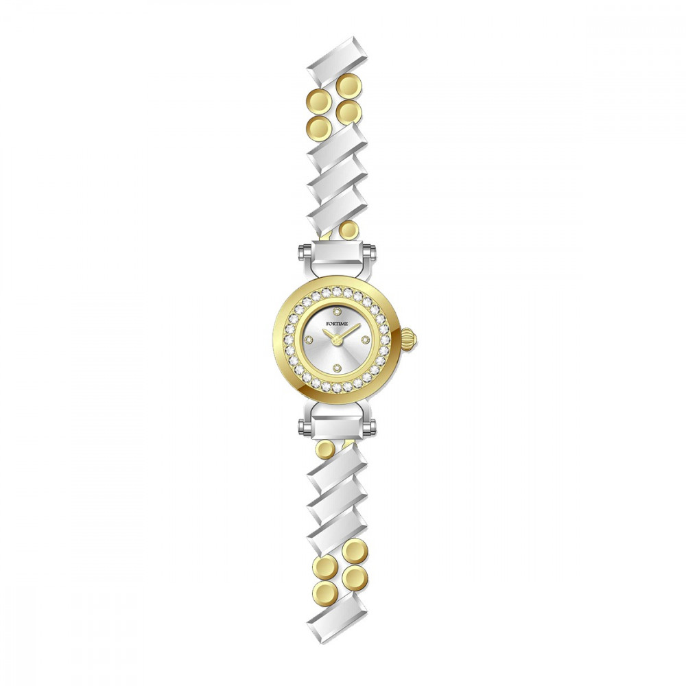 البصمه المثاليه لاطلاله تفيض بالتميز ، ساعات حريمى مرصعة بفصوص الزريكون بسير من الستيل باللونين الذهبي والفضي ، تتميز الساعة بالتفاصيل الأنيقه في المينا والإطار المزين بفصوص الزركون وسير مميز ، ساعة بمينا فضية اللون بعقربين ، ساعة أنيقه تناسب إطلالتك في كل الأوقات .