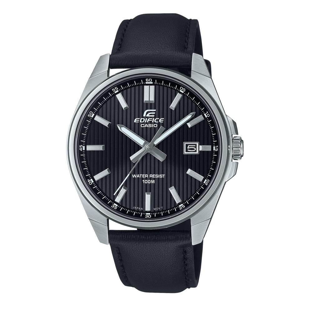 Enjoy the easy wearability of a contemporary classic, representing elegance and simplicity in an analog design focused on the hour, minute and seconds hands. The design features solid, sharp index markers and a very durable strap made of tough leather, adding a touch of elegance to the classic sporty look. As with all EDIFICE watches, this watch offers water resistance to a depth of 100 meters.