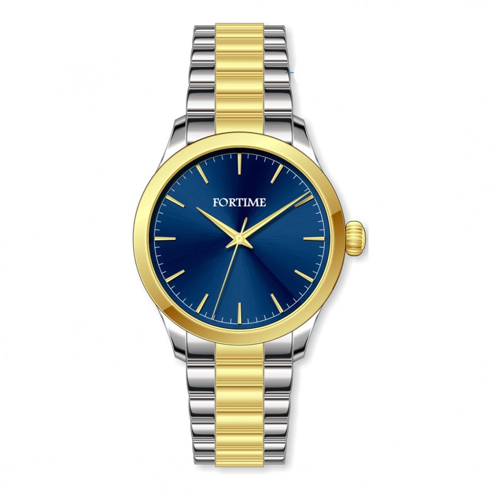 A practical men's watch with a classic design from the Four Time brand. The watch is designed from polished steel with a wide stainless steel strap in gold and silver and a navy blue dial . The watch is also decorated with distinctive lobes. It is a practical and lightweight watch in calm and neutral colors, making it one of your favorite options to wear with Formal or casual clothes.
