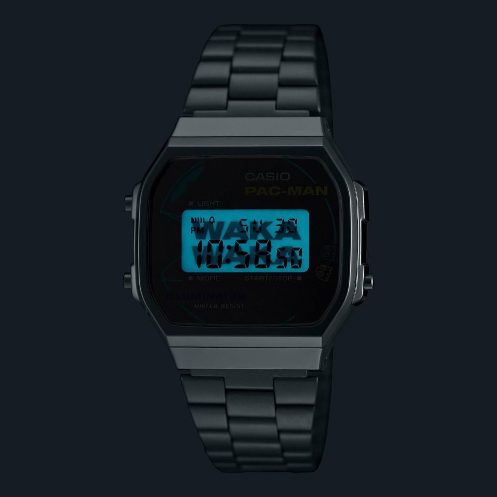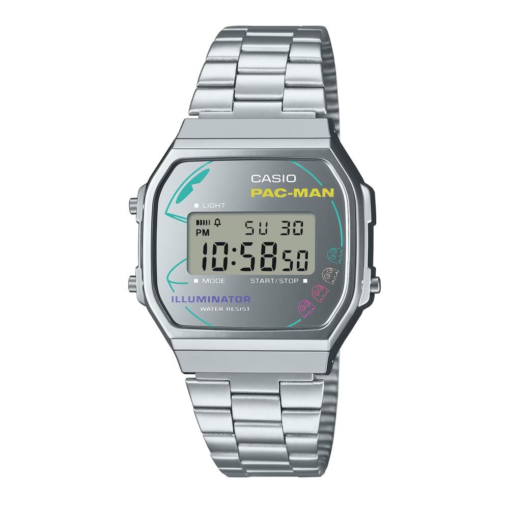 We present a full range of exciting collaborations to celebrate 50 years of Casio timepieces and prepare you for the 45th anniversary of PAC-MAN in 2025. With fun designs and a touch of nostalgia, this collection brings to life the world of PAC-MAN, the popular game from Namco Bandai Entertainment. A silver vapor deposition dial, a bold face design featuring PAC-MAN and the four ghosts (Blinky, Pinky, Inky, and Clyde), and a palette of bright neon colors give the design a modern touch. “WAKA WAKA” (Waka Waka)—the sound of PAC-MAN eating cookies—is written on the clasp cover and LCD screen (when lit) for an extra touch of fun. PAC-MAN and his logo are also engraved on the back of the case. It comes in a distinctive neon-designed box.